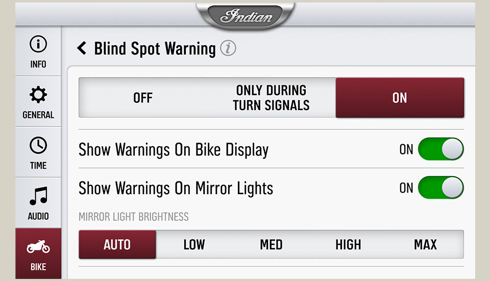La configuration des fonctions du Rider Assist est accessible via l'écran des paramètres du Rider Assist. Une personnalisation plus poussée de l'avertisseur d'angle mort et de l'avertisseur de suivi peut être effectuée via le sous-menu des caractéristiques sélectionnées.