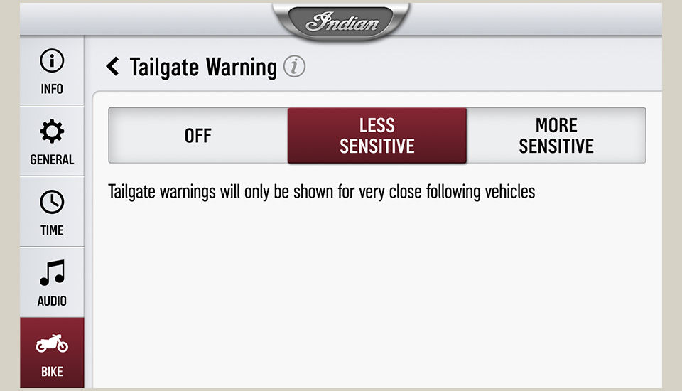L'avertisseur de suivi est une fonction qui informe le pilote via l'écran RIDE COMMAND lorsqu'un véhicule s'approche de l'arrière de la moto à grande vitesse et talonne le pilote. Il existe deux niveaux d'alerte différents pour cet avertisseur. L'alerte affichée dépend de la vitesse et de la distance relative des véhicules. L'avertisseur peut être désactivé dans l'écran de réglage du Rider Assist. Le niveau d'alerte affiché dépend de la gravité de l'approche et du suivi.